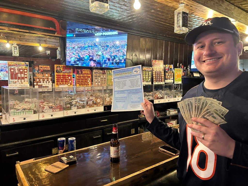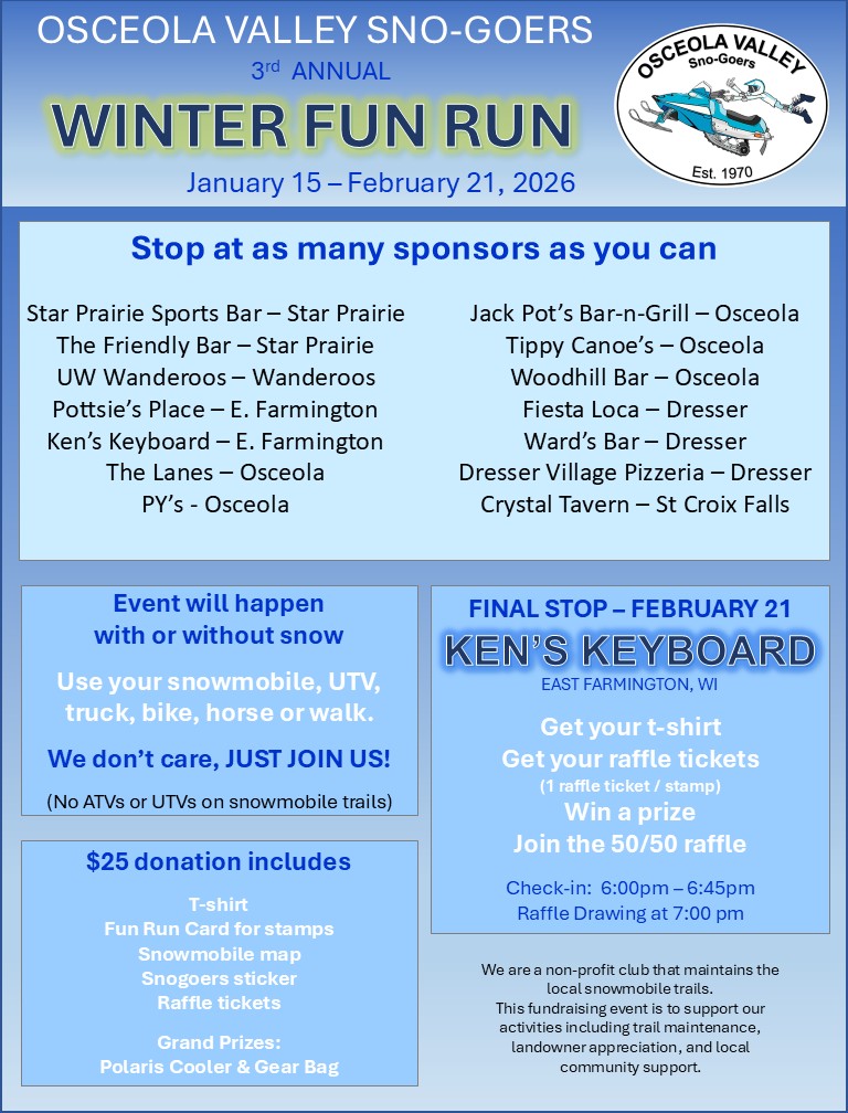 Our 3rd Annual Winter Fun Run is in full swing. Stop at any of our 14 key sponsors and get your winter fun run card. We already have reports that a new sponsor (Crystal Tavern, St Croix Falls) has been a great addition. It’s a downtown bar that specializes in pull tabs and reasonable drink costs when you play the pull tabs. Even a Bear’s fan can win there.